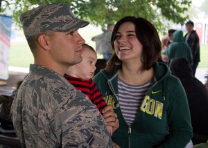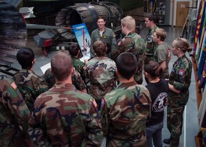 Capt. Brian Loftus, 419th Security Forces Squadron commander, and Master Sgt. Matthew Mason, 419th SFS first sergeant, talk with Airman 1st Class Jeffrey Howcroft, a 419th SFS reservist, during the September UTA. The new commander took some time to meet the Airmen under his command during his first
