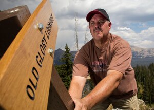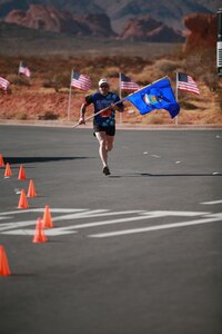 Master Sgt. Timothy Gill, 419th Security Forces Squadron, holds an Air Force flag while nearing the finish line in a recent race. Gill, a marathoner with 20 races under his belt, has helped raise thousands of dollars for the Huntsman Cancer Foundation. Gill also trains new runners, many of whom are