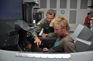 Senior Airman Dallin Smith, 455th Expeditionary Aircraft Maintenance Squadron, connects an electronic testing device to the bomb rack of an F-16 Fighting Falcon to verify the jet's ability to drop weapons correctly. At home, Airman Smith is a reservist in the 419th Aircraft Maintenance Squadron.