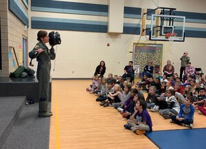HILL AIR FORCE BASE, Utah -- Col. Gina Sabric, 419th Fighter Wing commander, took some time away from flying the F-35 Lightning II to speak with students at Burch Creek Elementary Oct. 28 as part of a patriotic-themed assembly at the South Ogden school. Sabric shared her story with a couple hundred
