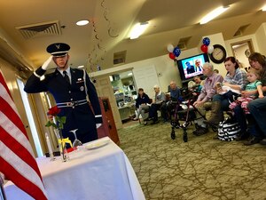 HILL AIR FORCE BASE, Utah -- Staff Sgt. Kannon Thompson, 419th Fighter Wing Honor Guard member, performs the POW/MIA table ceremony during a Veterans Day program at Chancellor Gardens Assisted Living in Clearfield, Utah, Nov. 11. The Air Force reservist took part in the ceremony with his