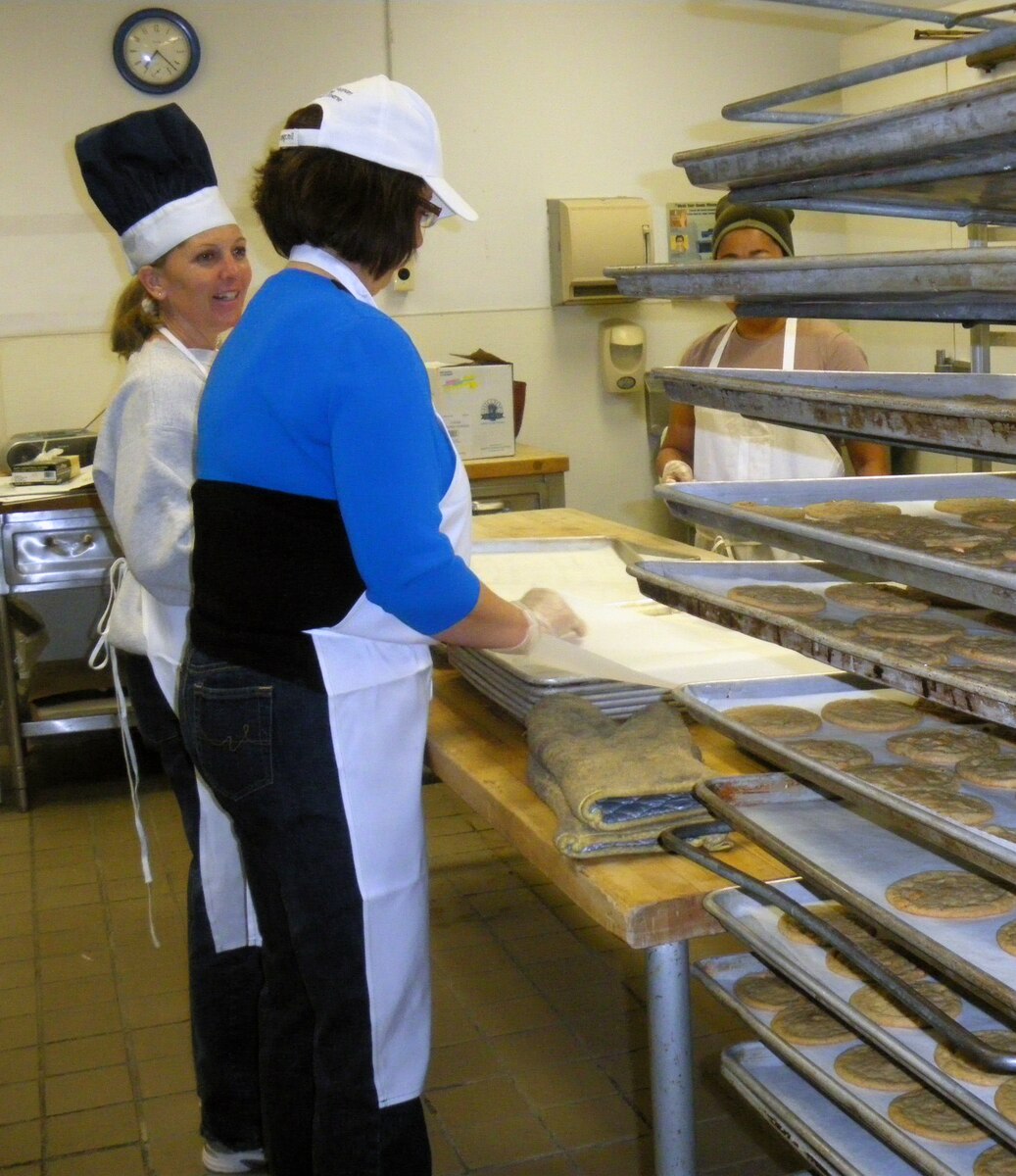 Lt. Col. Lynne Hull, 419th Fighter Wing inspector general, and Master Sgt. Kathalene Hale, 419th FW historian, bake cookies to be delivered to wing personnel during the December UTA. (U.S. Air Force photo/Staff Sgt. Kyle Brasier)